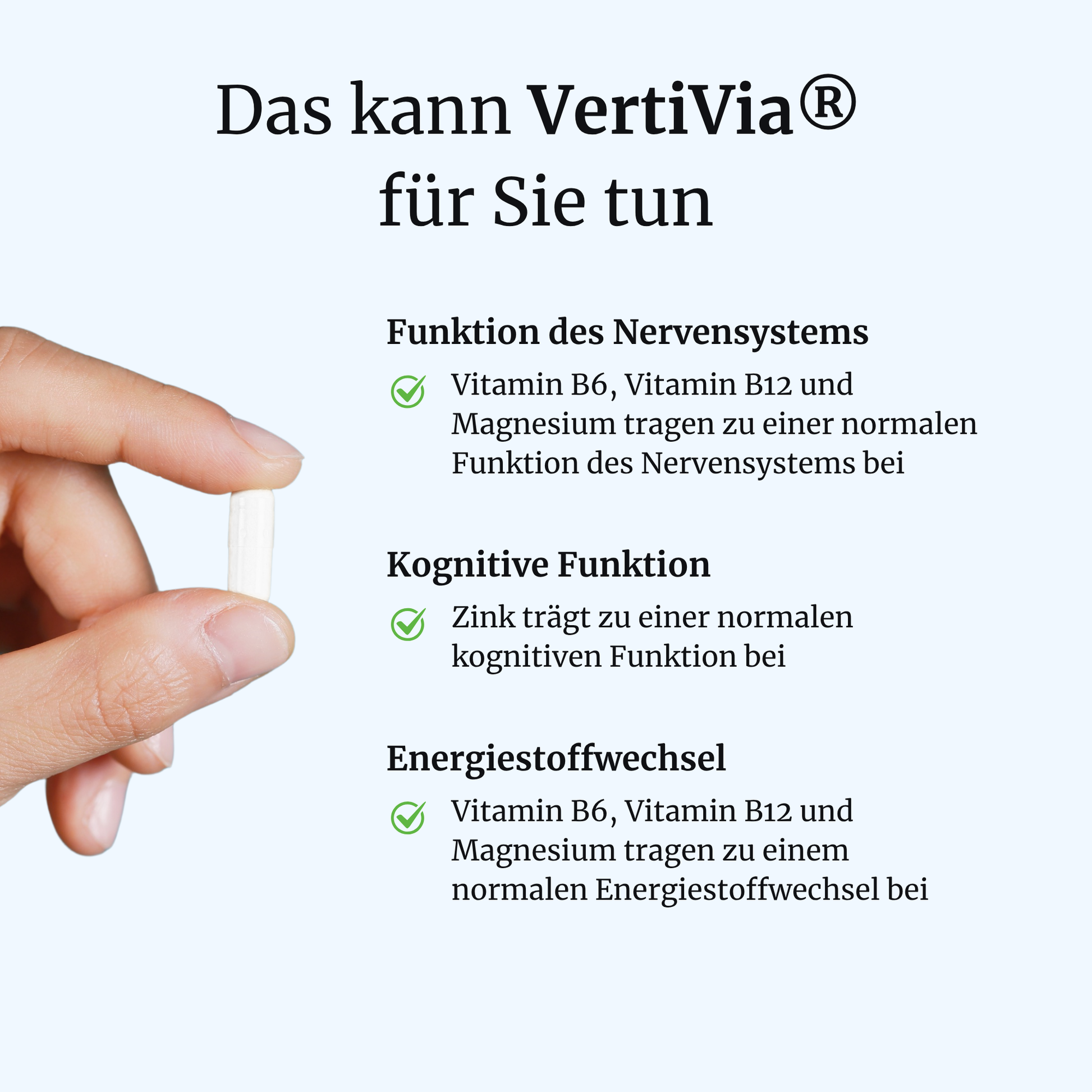 *Alle gesundheitsbezogenen Angaben beziehen sich ausschließlich auf die in VertiVia® enthaltenen Mikronährstoffe im Rahmen der von der EFSA zugelassenen Health Claims.